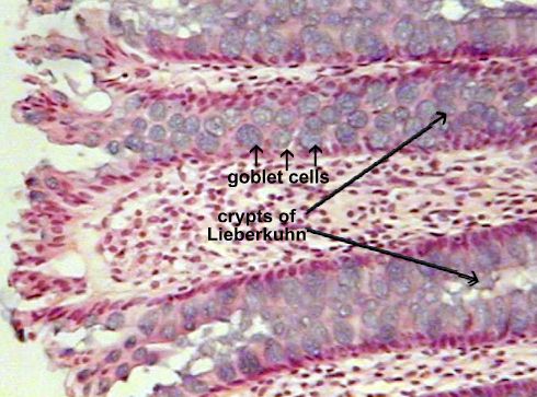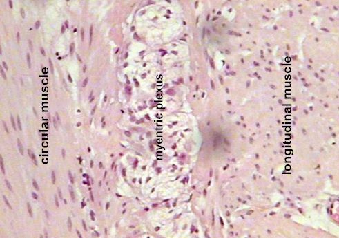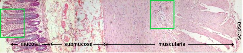 Click on the green squares to see details of the muscosa and muscularis externa. |