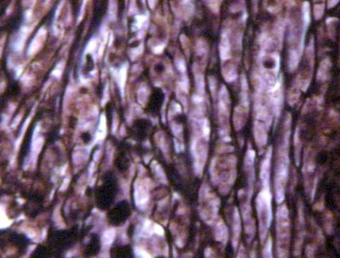 The black reticular fibers (collagen) in the adjacent photo are specially stained to show up. The other lymphatic photos of the node, spleen and thymus are stained to show the numerous cells.