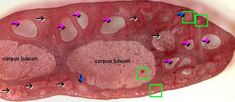 Click on the green squares to see the primordial and primary follicles. Also details of the secondary follicle and corpus luteum