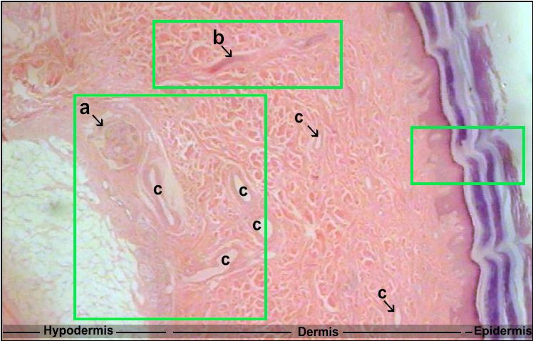 Note the many blood vessels surrounded by the collagen fibers of the dermis.