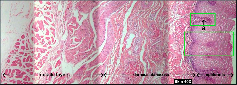 a Note the dermal papillae with capillaries. Click in the green square to see the details.