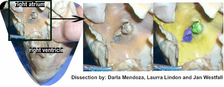 Note - The thin shiny smooth lining of the heart (endocardium) made up of simple squamous epithelial cells. Explanation - The tricuspid valves 3 cusps are stretched out due to the dissection. The moderator band adds another pathway to the electrical conduction path to carry the depolarization wave more quickly to the myocardium. |